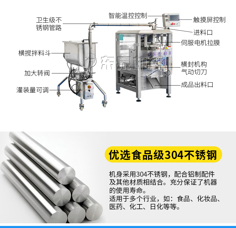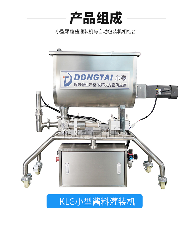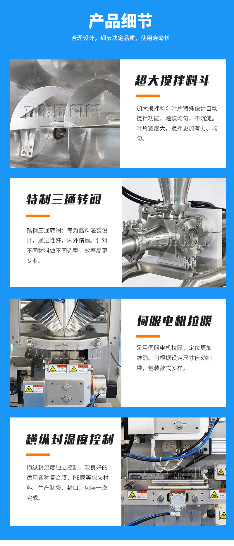 本機器主要用于調味品醬料的自動化包裝,機器安裝有橫向螺帶式攪拌,使油醬混合均勻,確保灌裝精度和產品包裝成品的均勻性。灌裝計量設備安裝有萬向輪,管路鏈接均采用快拆接頭,方便灌裝機拆卸移動清洗。包裝設備采用全伺服驅動器,包裝速度快,運行穩(wěn)定。