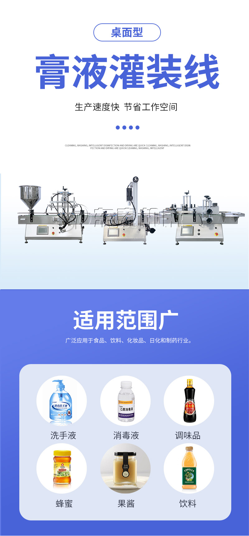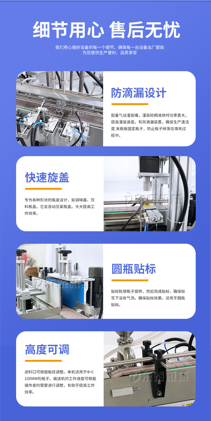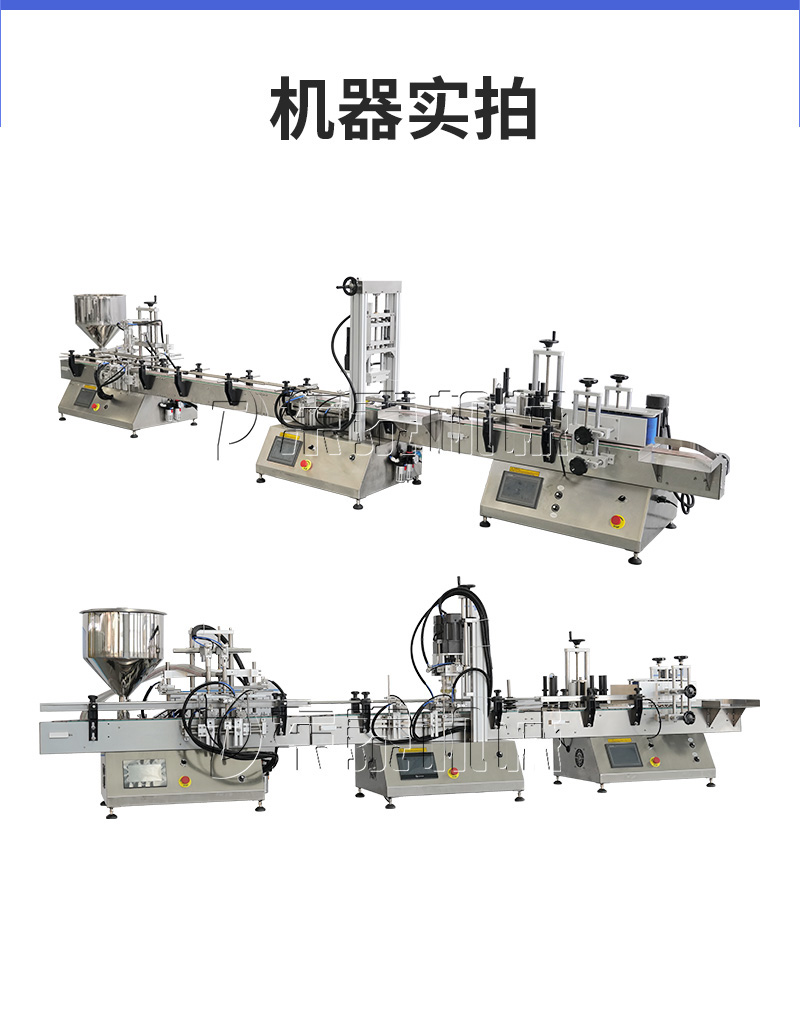 產(chǎn)品說明:生產(chǎn)線根據(jù)灌裝范圍選擇型號(hào),灌裝部分為雙頭下潛式灌裝機(jī),適用于不同物料不同瓶子的灌裝,配備自動(dòng)壓蓋機(jī)和圓瓶貼標(biāo)機(jī),可實(shí)現(xiàn)不同蓋子的旋蓋貼標(biāo)工作。