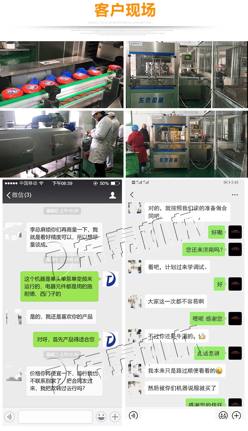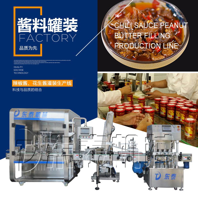 該生產(chǎn)線適合中小口徑三旋、四旋玻璃瓶調(diào)味醬的分裝,適合醬料、含顆粒黏稠物料的灌裝,物料接觸部分均采用316不銹鋼,整機(jī)304不銹鋼,符合食品衛(wèi)生標(biāo)準(zhǔn)。該機(jī)設(shè)計(jì)合理,機(jī)型小巧,立式結(jié)構(gòu),節(jié)省場(chǎng)地,操作方便。啟動(dòng)部分均采用德國(guó)FESTO和臺(tái)灣AirTack的氣動(dòng)元件。灌裝閥有氣動(dòng)閥控制,灌裝精度更高,灌裝量和灌裝速度均可任意調(diào)整,灌裝悶頭采用防拉絲及升降灌裝裝置。