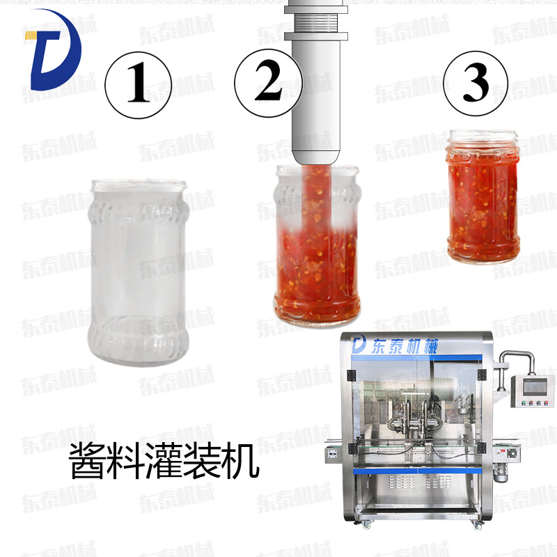灌裝機(jī)采用活塞式灌裝原理,適用于調(diào)味品中帶顆粒并且濃度較大的辣椒醬、豆瓣醬、花生醬、香菇醬、果醬、牛油火鍋底料、紅油火鍋底料、蝦醬等較為粘稠醬類(lèi)的灌裝。