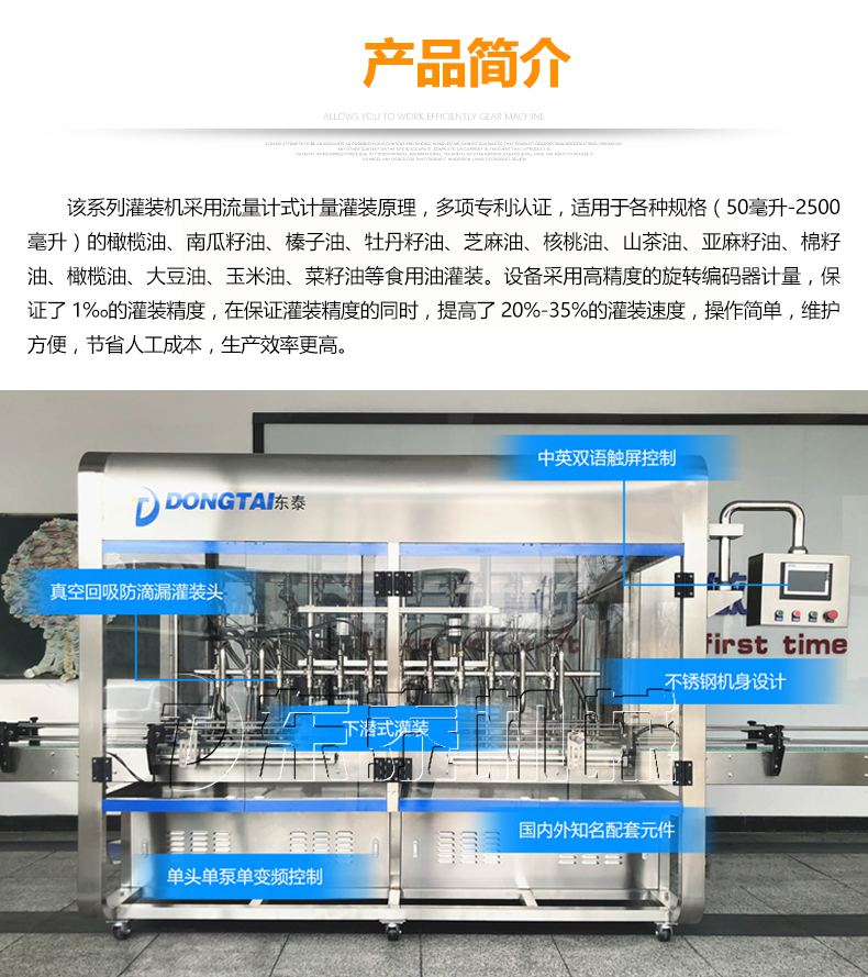 東泰機械至今有著二十年的研發(fā)生產(chǎn)經(jīng)驗,擁有著精良的技術(shù)團隊,東泰研發(fā)的橄欖油自動灌裝機,橄欖油灌裝流水線都是機電一體的新型設備,橄欖油自動灌裝機計量采用高精度流量計與微電子數(shù)控儀表相結(jié)合的方式,灌裝精度相當高,還可以方便的進行無級調(diào)解灌裝容量,非常直觀,操作非常簡單。選擇包裝設備就要選經(jīng)驗豐富、技術(shù)超前,設備完善的的大企業(yè),東泰機械通過二十多年的努力和發(fā)展,現(xiàn)已成為集科研、設計制造、成套供應、技術(shù)咨詢服務、工程總承包為一體的高科技型企業(yè)。東泰期待與您的合作,我們互利共贏!