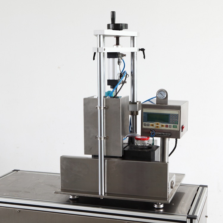 待加蓋的瓶子是手動進(jìn)料和手動卸載的。在加蓋過程中,瓶子正好放在旋轉(zhuǎn)的蓋帽上方,蓋子上蓋有蓋子。密封頭具有內(nèi)置的垂直運(yùn)動,其中帶有蓋子的瓶子置于其下方收緊。